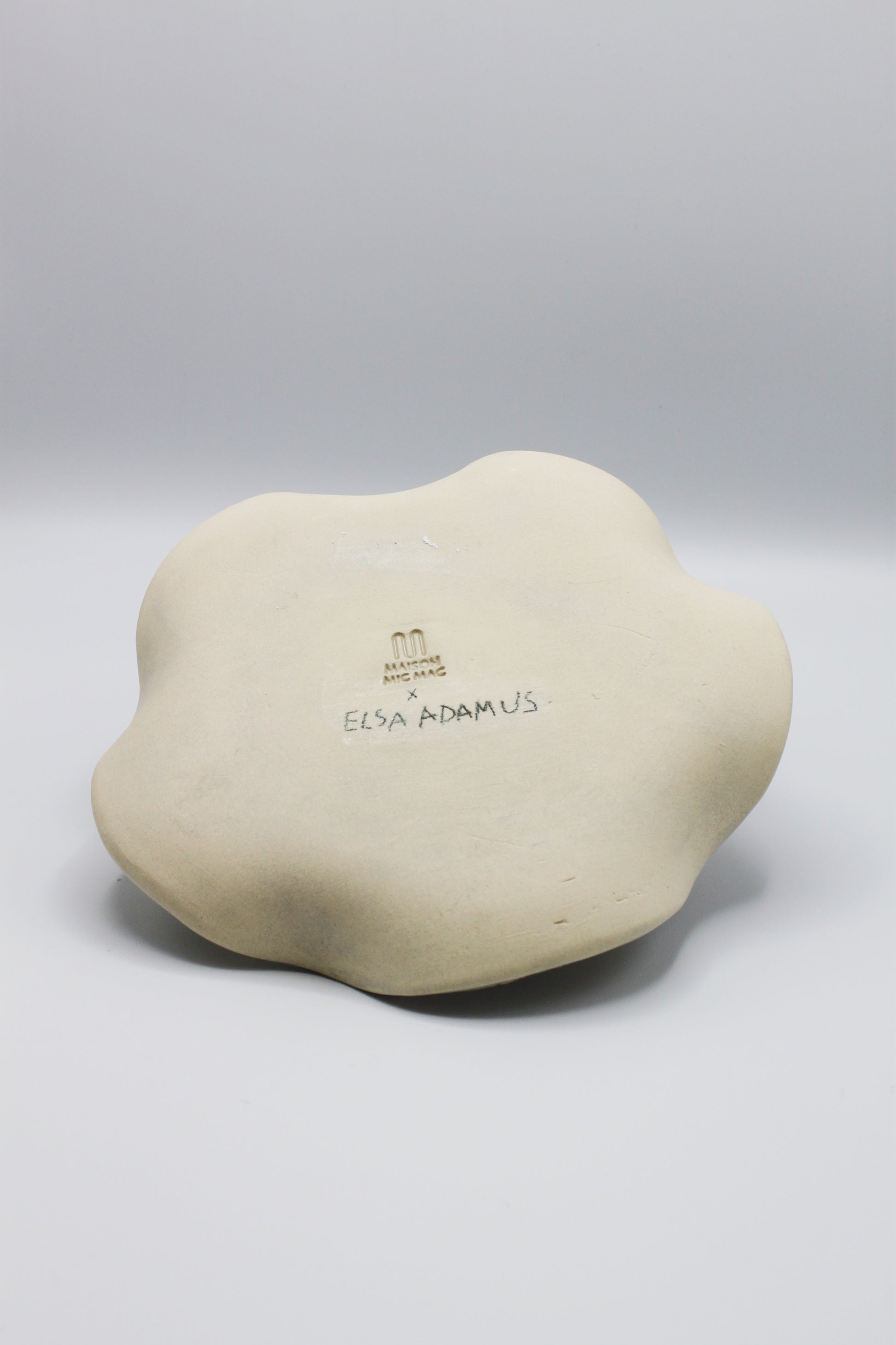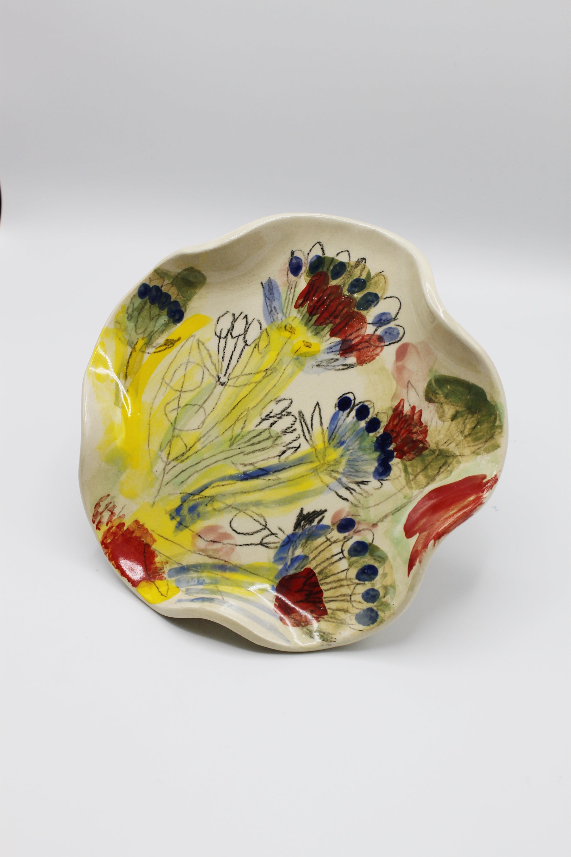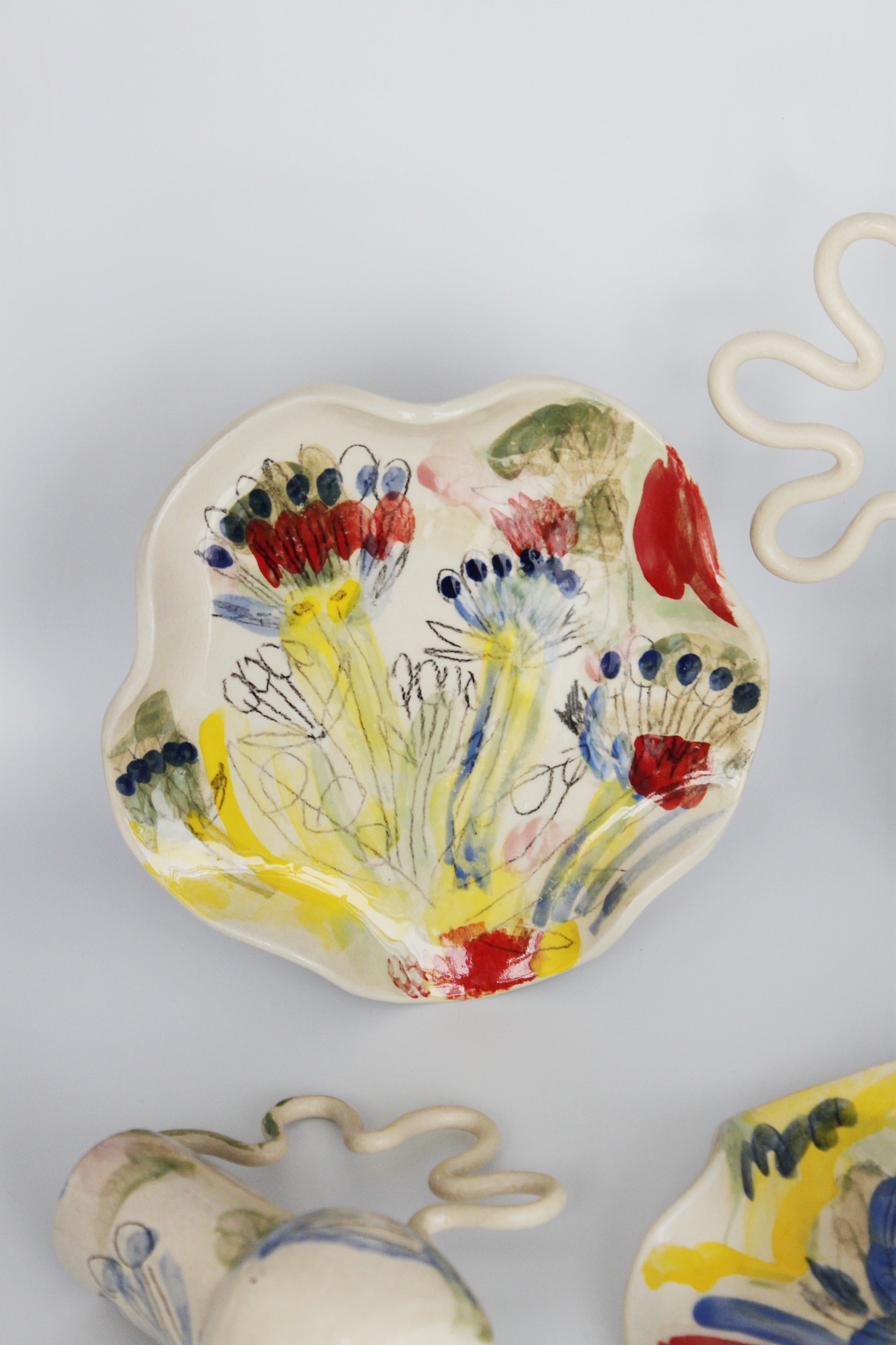 Cette collection à quatre mains est le fruit d’une collaboration intuitive entre nos deux univers. J’ai façonné des assiettes et des vases en grès, Elsa y a apporté sa touche libre et sensible en y peignant des formes naïves et colorées, empreintes de poésie.