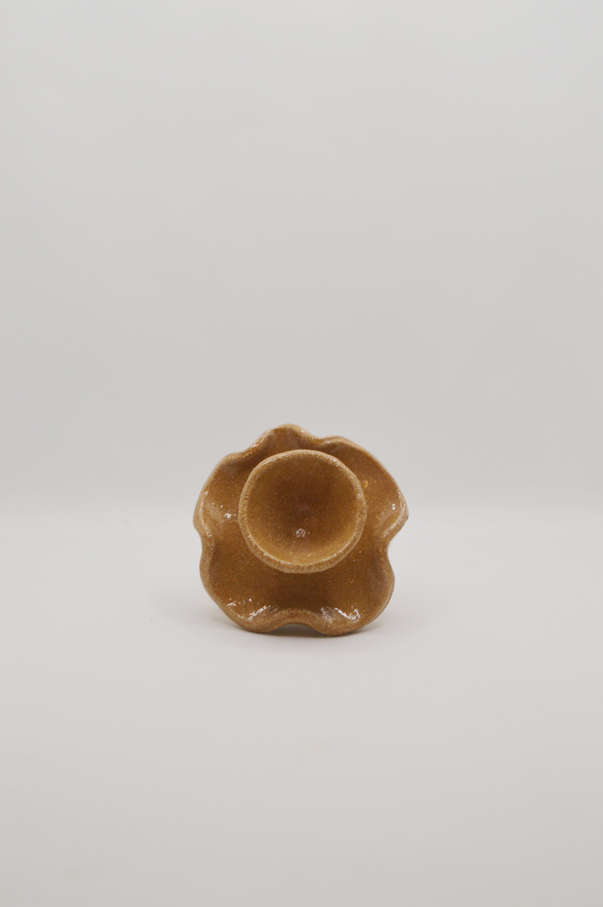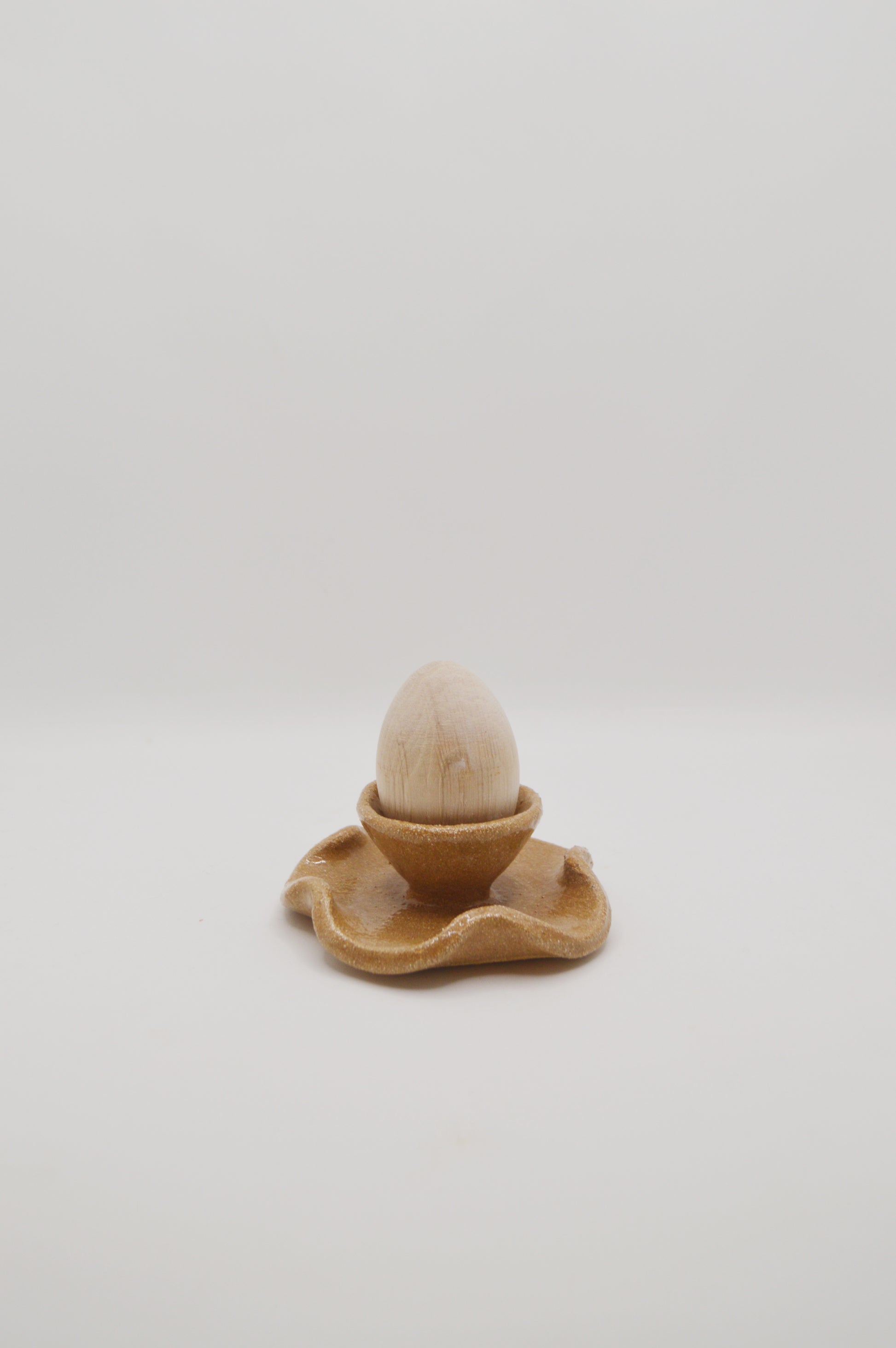 Grès mocha chamotté et émail transparent; hauteur 3,5cm, diamètre 9,5cm, ouverture pour l'oeuf 4cm, poids environ 150g.