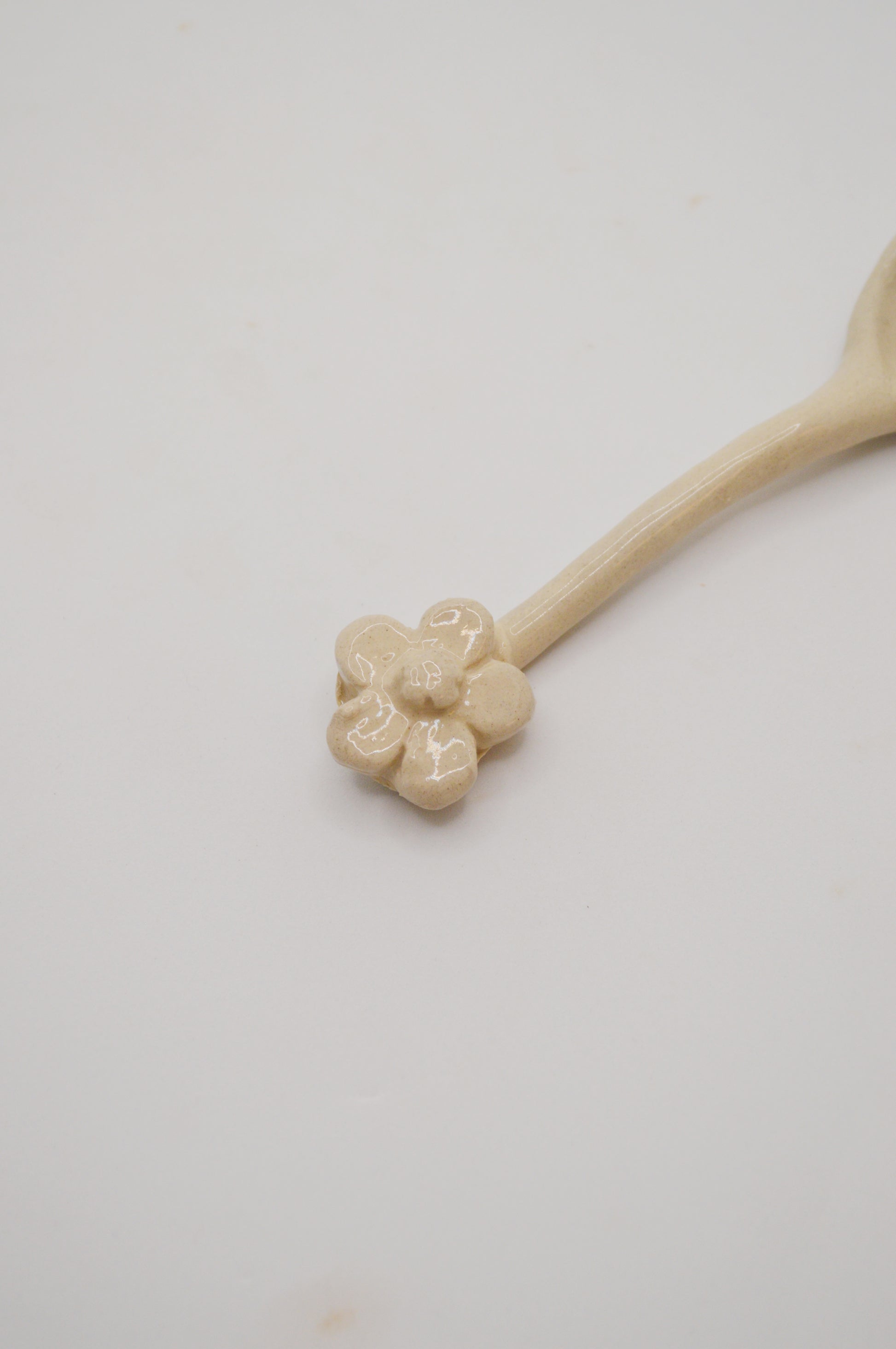 Grès crème lisse et émail transparent, longueur totale 12,5cm, hauteur totale 1,5cm, longueur cuillère 2,8cm, largeur cuillère 3,5cm, poids total 28g.