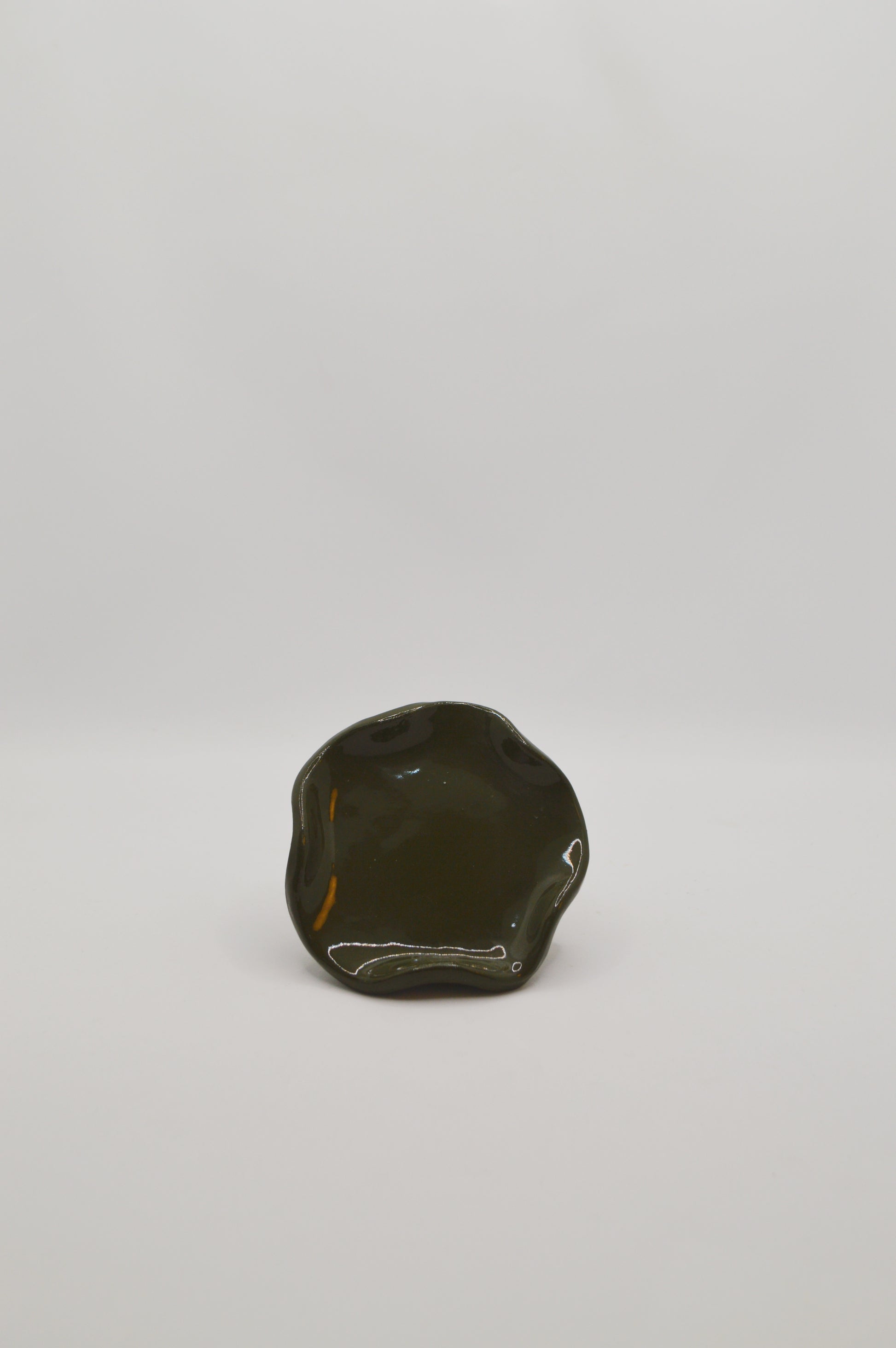 Grès crème lisse, engobe olive et émail transparent; hauteur 1,5cm, diamètre 9,5cm, diamètre intérieur 6,5cm , poids environ 100g.