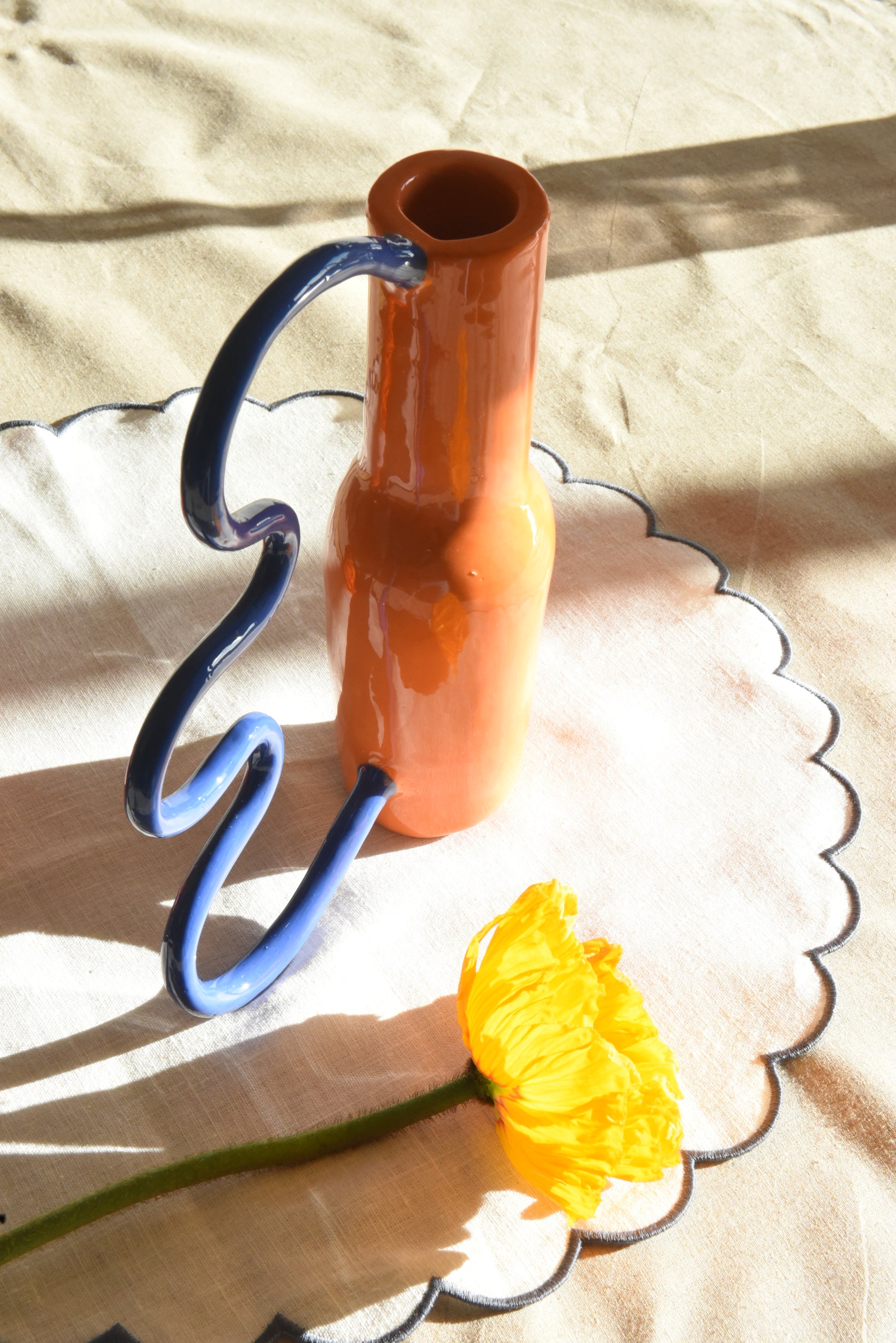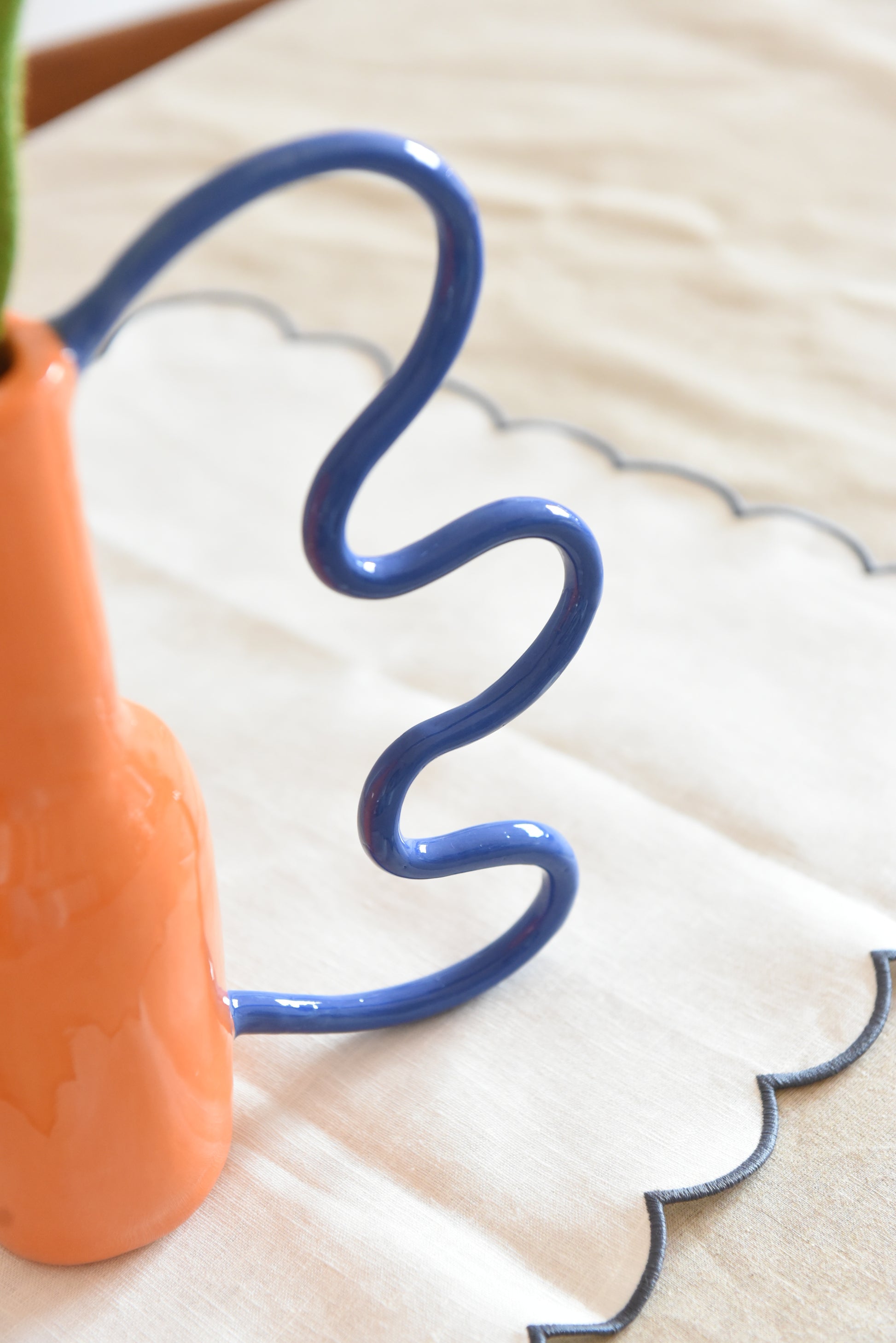 Grès blanc lisse, engobe orange et bleu cobalt et émail transparent.